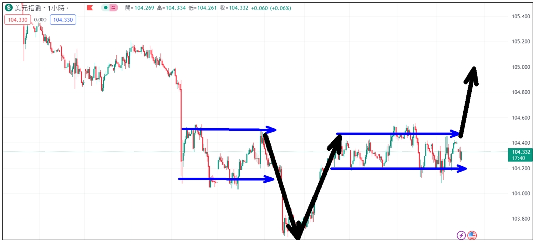 另外,技術分析面切入1小時級別觀察美元指數符合上週分析觸底反彈上漲,目前K棒高點區間狹幅震盪,短線若突破區間壓力,則有望持續反彈上漲一段。